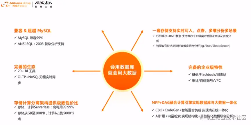 为了解决以上问题,我们构建这套离在线一体的架构。我们的愿景是:让用户会用数据库就会用大数据。第一,是我们是高度兼容MySQL,我们对MySQL的兼容超过了99%。AnalyticDB MySQL是一个云原生的架构,并且是存储计算分离的,存储计算可以分别扩缩容。我们用一套存储系统支持了实时写入以及多维的分析,并且通过智能索引来支持任意维度的分析。除此之外,我们具备例如审计、自建账号等完备的企业级的能力以及整套的备份还原能力。你如果误删了数据,AnalyticDB可以把数据闪回到你想要的时间点上。最后,我们的融合的计算引擎在同一套架构里面同时支持了离线和在线、结构化和非结构化数据的查询。