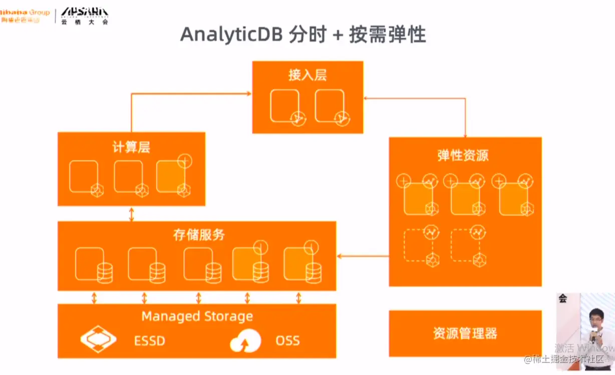 我们的分时和按需弹性是怎么做的呢?我们自己维护了一个资源池,然后在池子上写了一套资源管理器。当用户有弹性需要时,我们会从这个池子里面取出节点,加到用户的AnalyticDB里。当他用完时,我们会自动把这个节点归还回资源池里。整个过程是非常快的,我们可以在分钟级别完成这个操作。