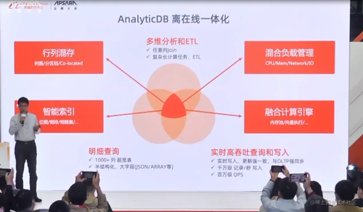 如果用户需要一个离在线一体化的系统的话,需要哪些功能?第一个,你需要有支持多维分析以及ETL的能力。同时,必须支持数据的明细查询和检索。最后,你还要支持实时的高吞吐的查询和写入。这三个需求的交集就是AnalyticDB想要做到的部分。我们通过支持混合负载的融合计算引擎来做到高性能的查询;我们通过行列混存以及深度优化的写入方式来达到高并发以及高吞吐的写入;然后我们通过智能索引来做到明细的查询以及数据内文本的检索。