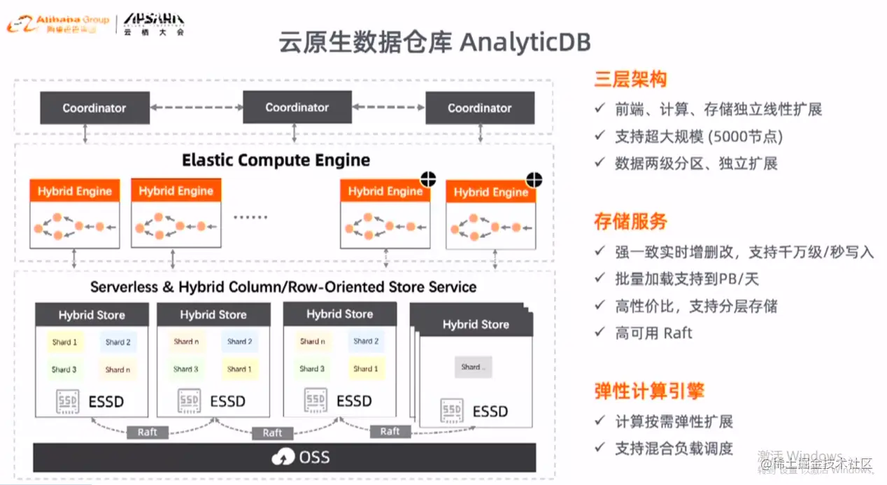 云原生数据仓库AnalyticDB的整个架构分为三层,最上面的是接入层,它负责生成一个执行计划,并且我们的优化器会优化这个执行计划、产生最终最优的物理计划、切分计划并且下发到计算层进行执行。整个数据的存储,我们是分为两级分区。一级分区,把数据打散在各个分片上面,保证了整个系统的水平扩展能力。第二部分提供了用户自定义的二级分区。你可以按照时间来分区,比如按照天或者小时来进行分区。我们的计算引擎也会自动根据这些分区来做分区裁剪。整个存储引擎支持强一致的实时增删改,你可以高并发的写入这些数据,并且数据写入后实时可见。与此同时,我们的计算引擎还支持混合负载。