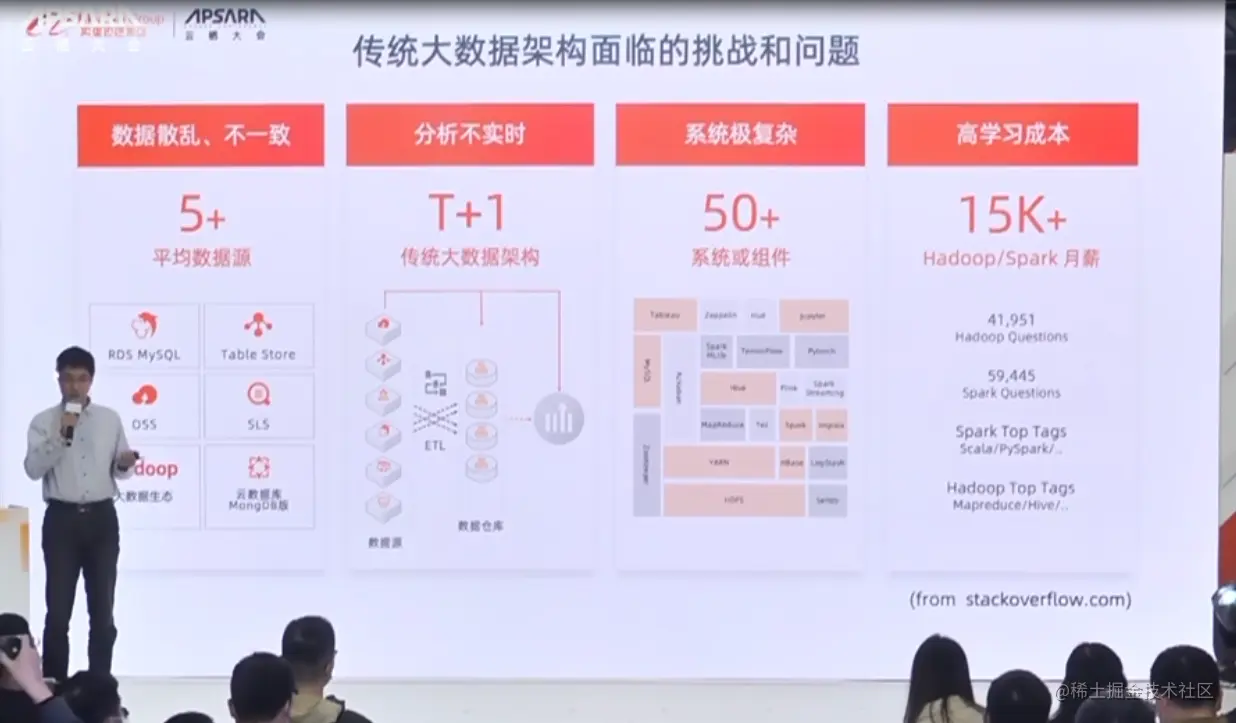 传统大数据架构面临的挑战和问题主要有:第一,数据散乱、不一致,没有一套统一的系统对这些数据进行分析。第二,分析不实时,一般会在夜间12点后对数据进行ETL清洗和转换,数据直到第二天的早上才能被查询到,数据时效性差。第三,系统复杂,为了解决数据时效性差的问题,一般的做法是在批处理上又引入了流式计算的引擎,形成著名的lambda架构,让整套系统变得越来越复杂。第四,高学习成本。专业的研发人员是非常少的,导致他们的工资非常高,所以要维护这一套系统的成本也非常高。