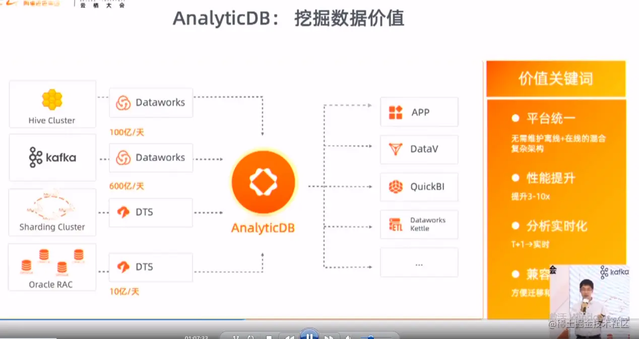 这部分讲的是AnalyticDB提供的高性价比。如果用户想把数据全部存在AnalyticDB上面的话,肯定会有冷存数据和热存数据。比如说用户想存三年的数据,但是有可能你只对最近一个星期的数据有热存的要求。因为最近一个星期的数据需要经常查,剩下的数据,用户希望低成本的把它存在AnalyticDB上,那就会放在冷存上面。所以我们提供了三种类型的表,一种是全热的表,数据全部存在热存。一种是全冷的表,数据全部存在冷存。还有一种是冷热混合,也就是部分数据可以存在热存里,剩下的数据存在冷存里。