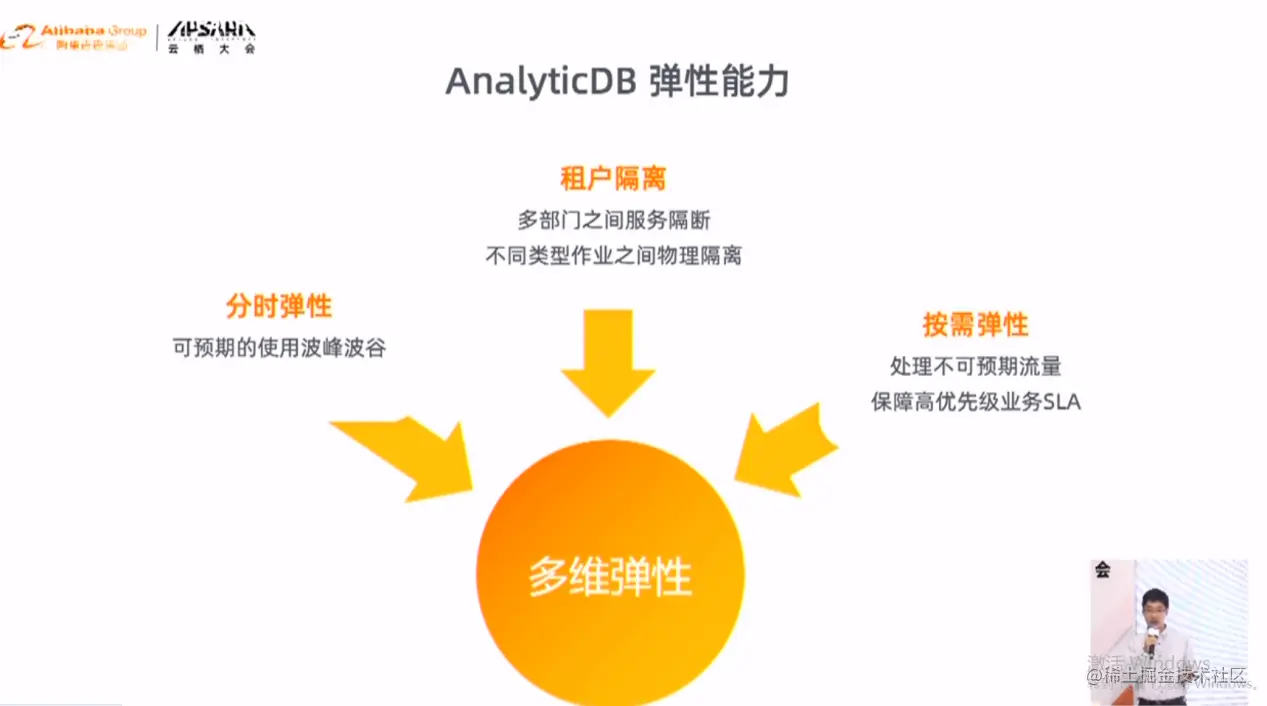 AnalyticDB提供了三种弹性能力,第一种是分时弹性。比如你知道下午4点到8点会有一个大促活动。那4点之前,我们会把这些计算节点帮用户给弹出来。第二个是租户隔离的能力,假如两个部门有不同的查询在同时跑,A部门的查询并不会影响B部门的查询。第三个是按需弹性。这个主要为了处理不可预期的流量,我们可以按需地弹出用户所想要的节点来保证高优先级业务的SLA。