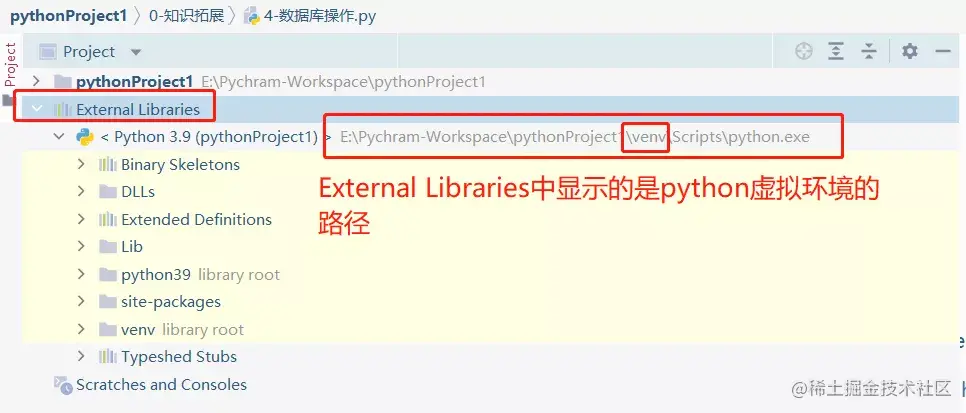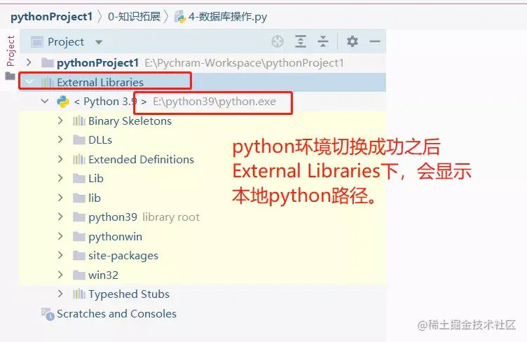 成功切换环境后,本地python环境路径将显示在【External Libraries】下。