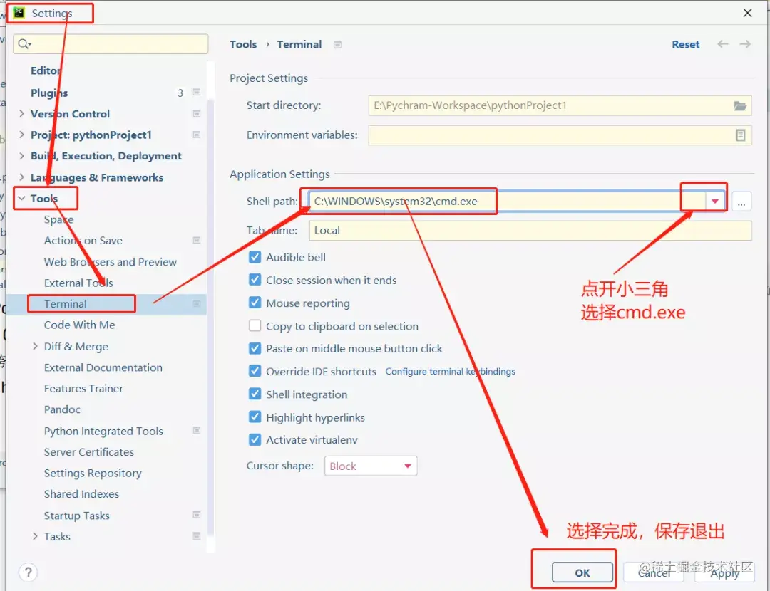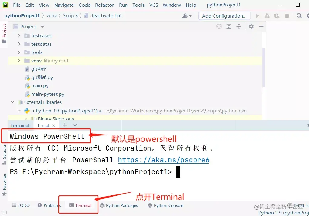 第一步:将 pycharm 的 Terminal 终端从 powershell 更换成 cmd.exe。(windows 环境)