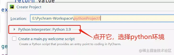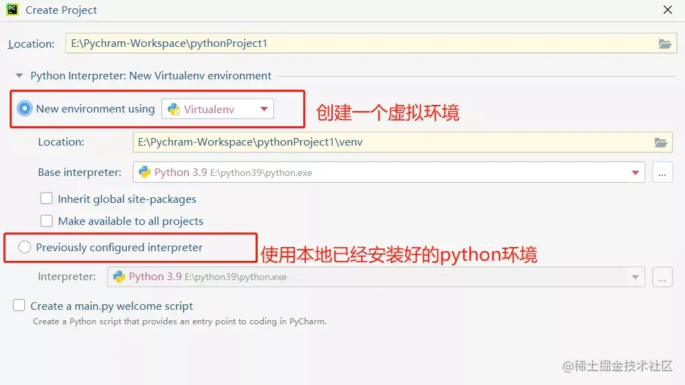 pycharm创建项目时,需要选择python环境,默认是创建虚拟环境。