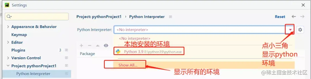 第一步:进入项目解释器配置界面。