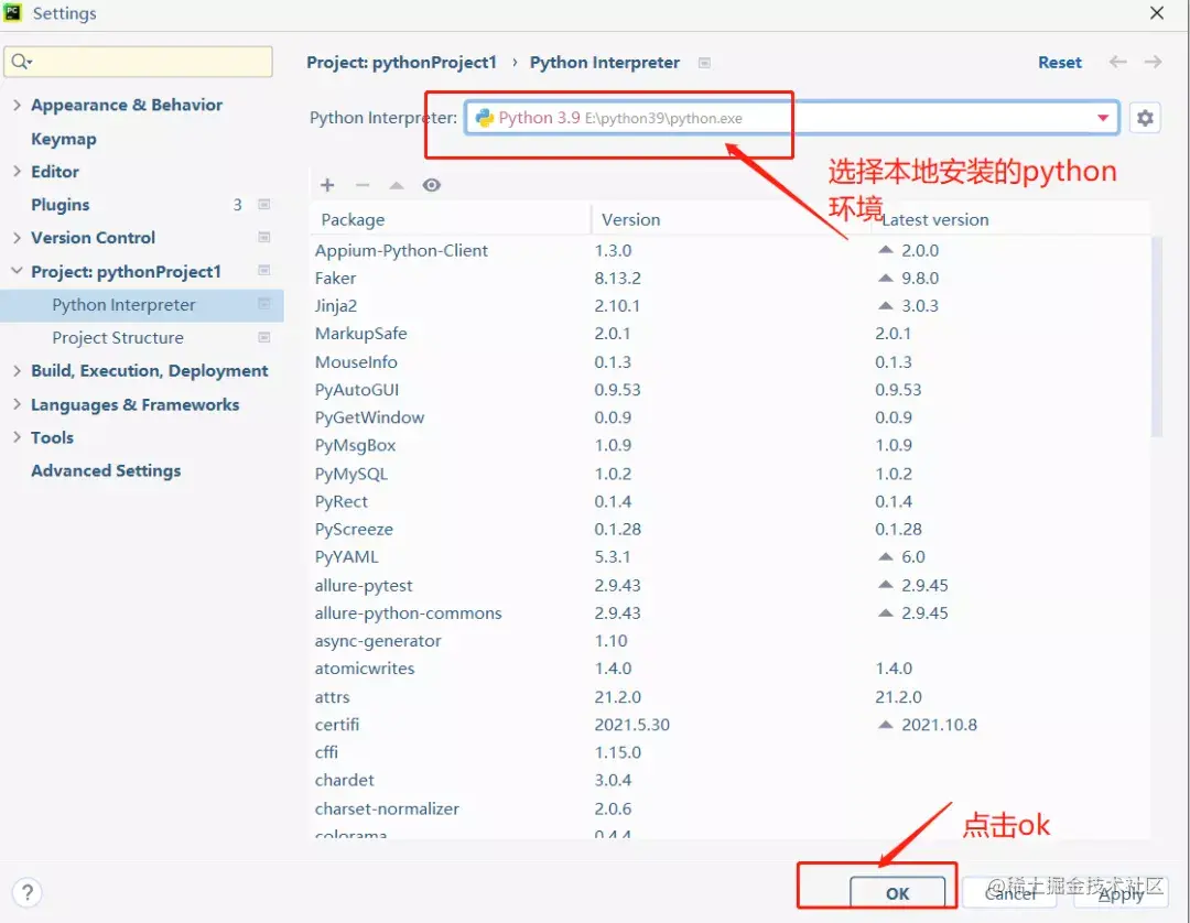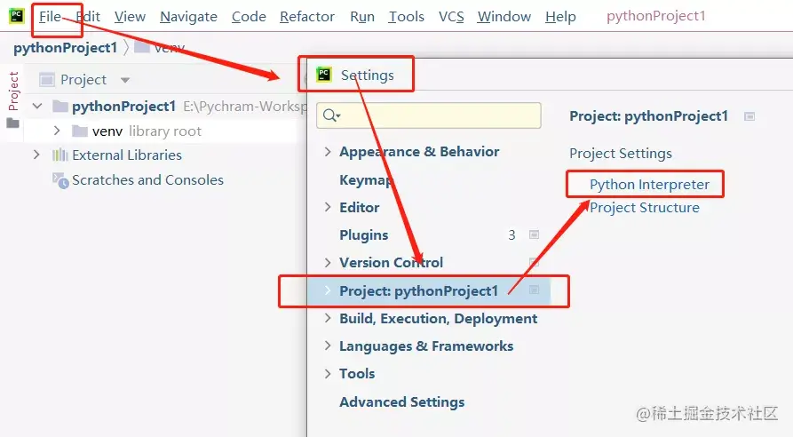 操作步骤:【File - Settings - Project:你的项目名称 - Python Interpreter】