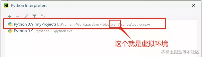 以显示所有环境,如下图所示。如果带有[venv]的环境路径是虚拟环境。