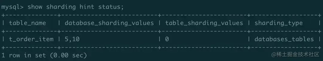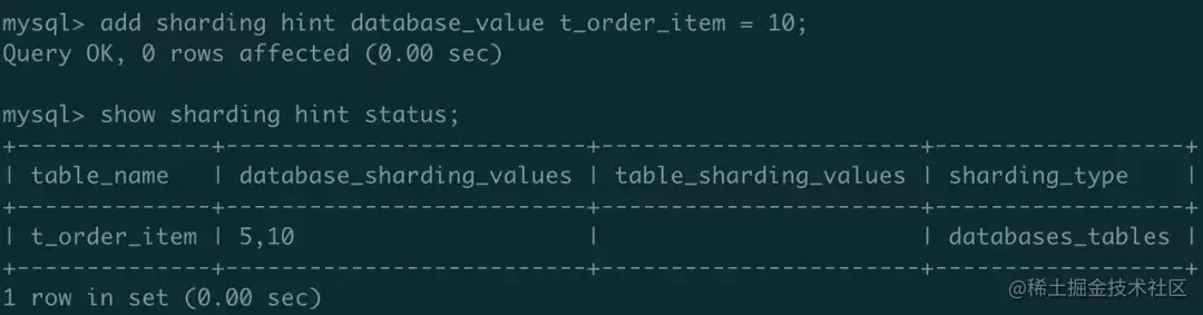 b. 执行 show sharding hint status; 显示 t_order_item 表对应的 database_sharding_values 值为 '5,10',table_sharding_values 的值为 '0':