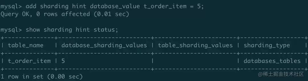 a. 设置成功,响应 Query OK, 0 rows affected; b. 执行 show sharding hint status; 显示 t_order_item 表对应的 database_sharding_values 值为 '5',且 sharding_type 值更新为 'databases_tables';