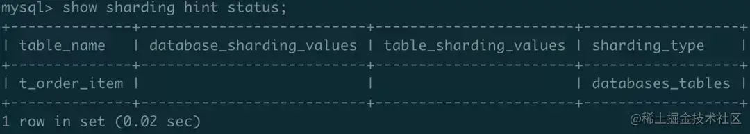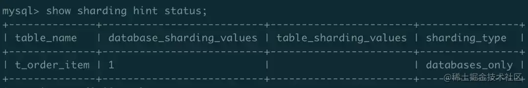 b. 执行 show sharding hint status; 显示 t_order_item 表对应的 database_sharding_values 值为 '1', 且 sharding_type 值更新为 'databases_only';