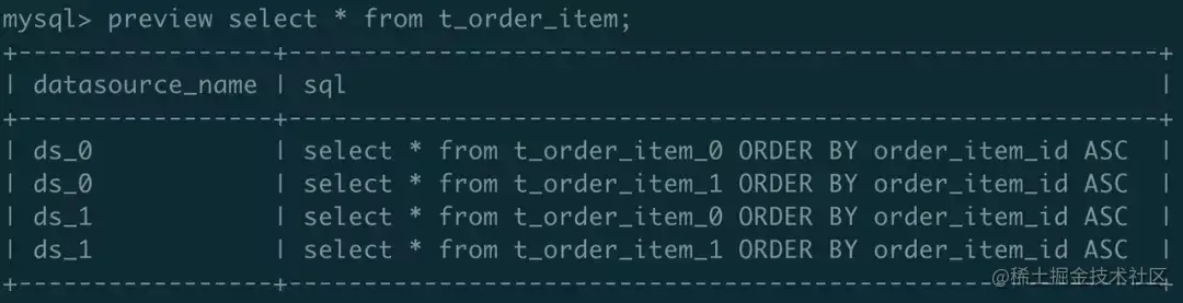 c. 执行 preview select * from t_order_item; 路由情况如下图,每个库只查询 t_order_item_0: