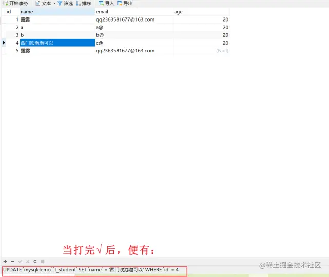 2-2,还可以使用图形化的方式修改表格中的列的值,打√ 还可以看到对应的sql语句: