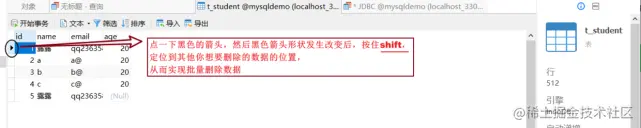 4,批量删除数据,处理使用sql操作语句外,还可以直接通过Navicat的图形界面进行操作: