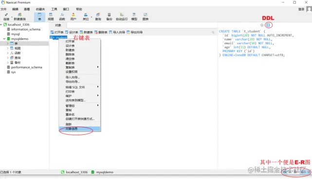 1,右键表【选择对象信息】,发现你可以拥有E-R图、DDL: