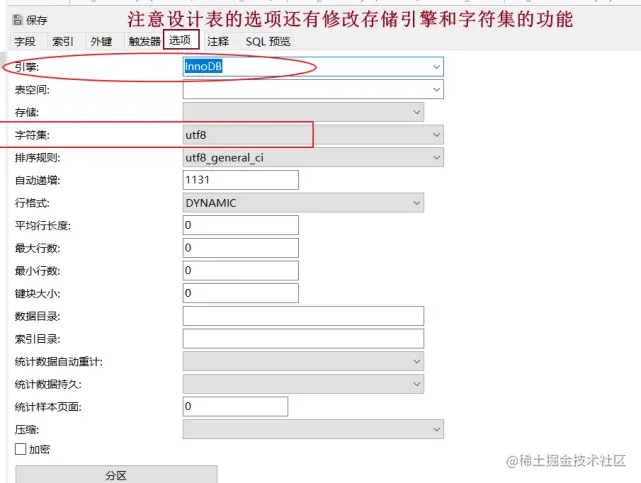8-1,注意:设计表的选项还有其他功能:修改存储引擎、字符集