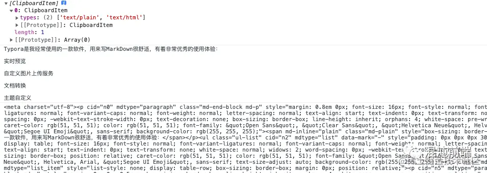 我很好奇为什么会出现两种不同的结果,Typora应该是使用Electron(或类似技术)开发的,我尝试用Clipboard API来进行测试:
