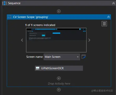 The application you want to automate can be indicated to the CV Screen Scope activity by using the Indicate On Screen button in the body of the activity. After doing this, a capture of the screen you have indicated is displayed in the body of the activity.