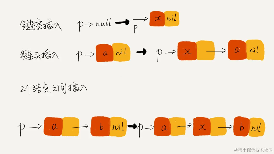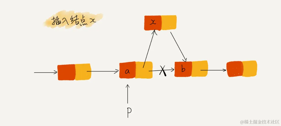 p→next=q:p 结点中的 next 指针存储了 q 结点的内存地址\