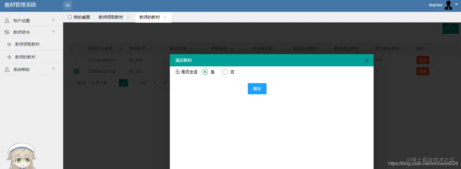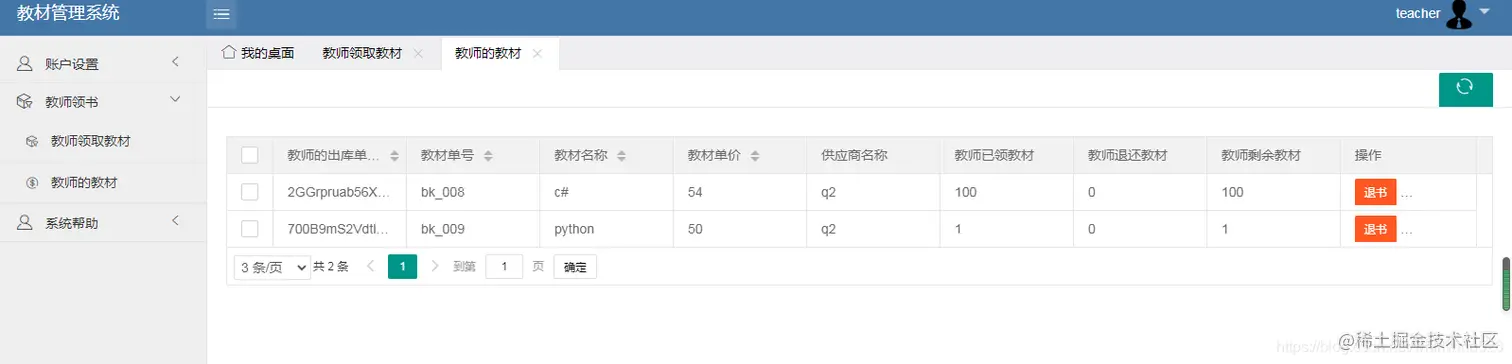 教师可以领取入库的教材,可以退还教材。