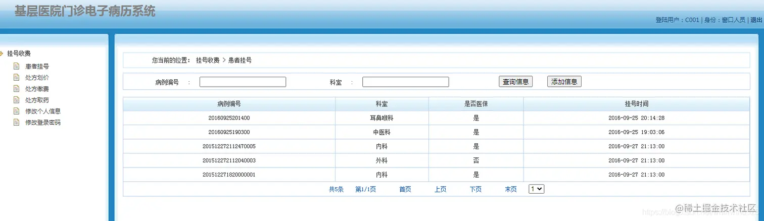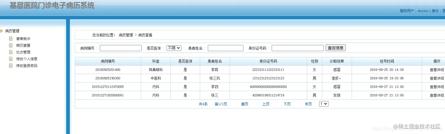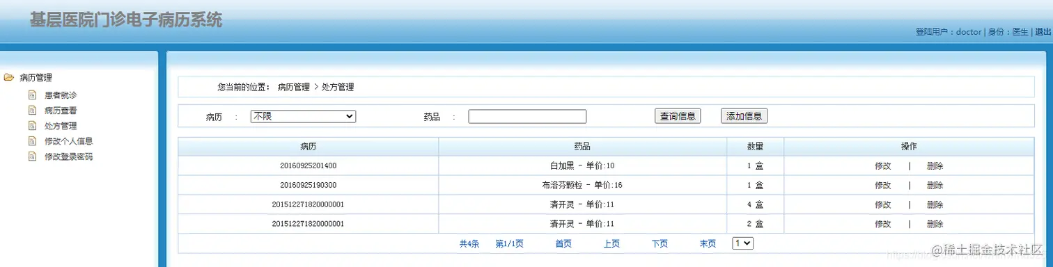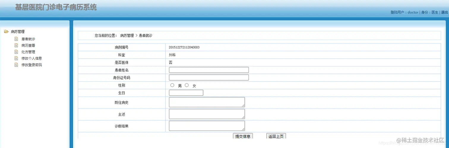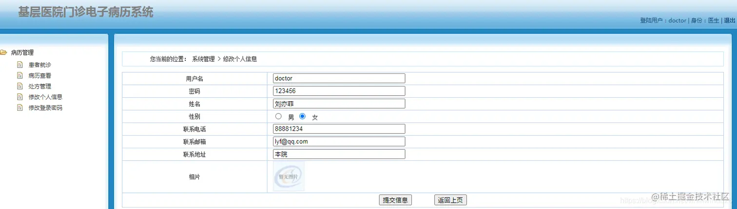 医生角色:主要进行患者就诊,病历管理,处方管理,个人信息管理等功能。