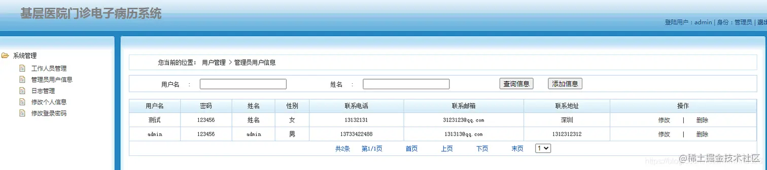 管理员角色:主要管理工作人员信息,管理员信息,系统日志等。