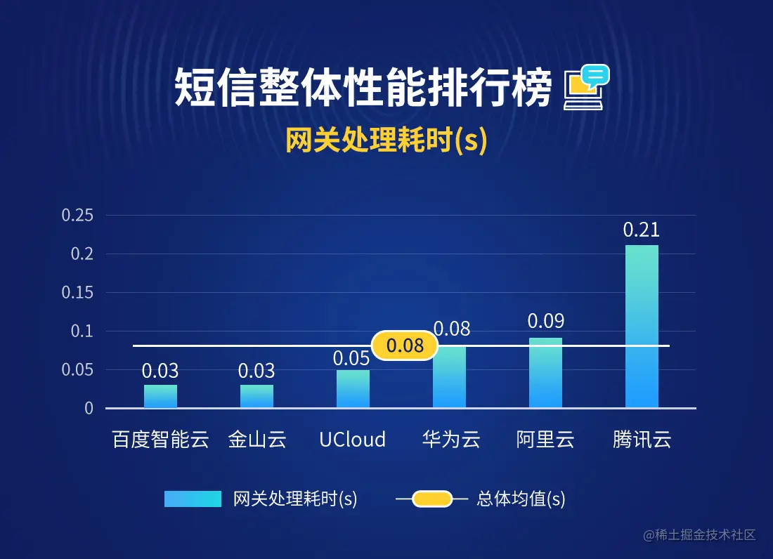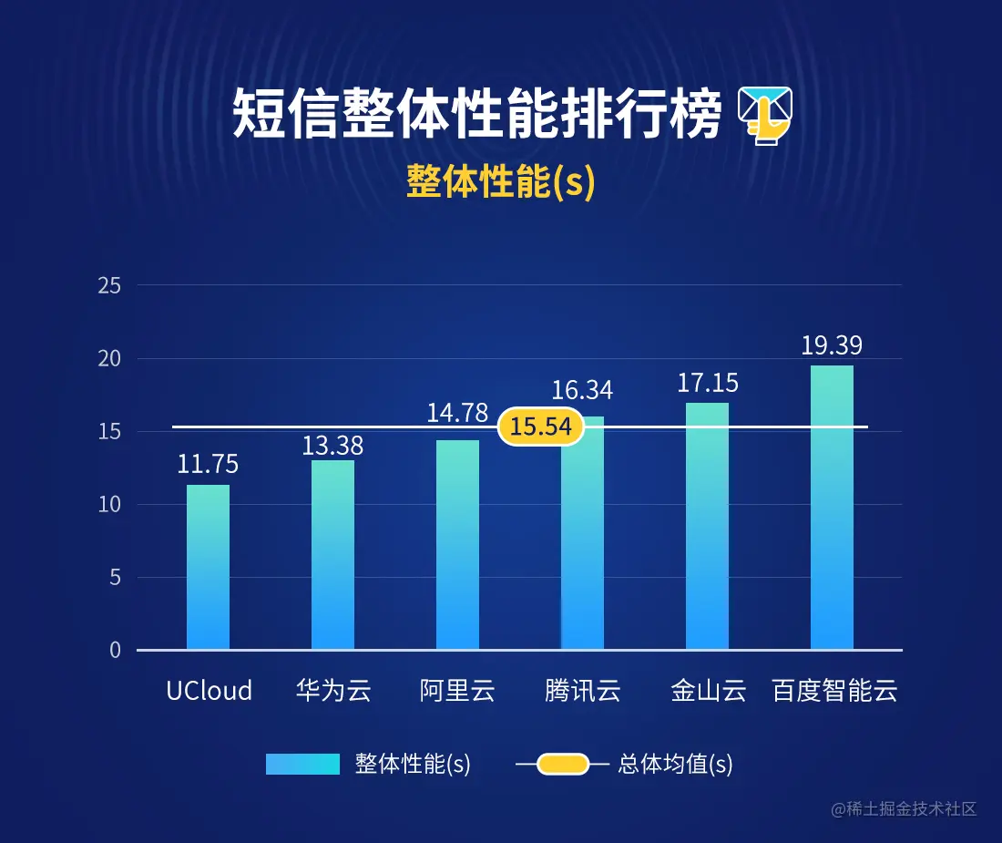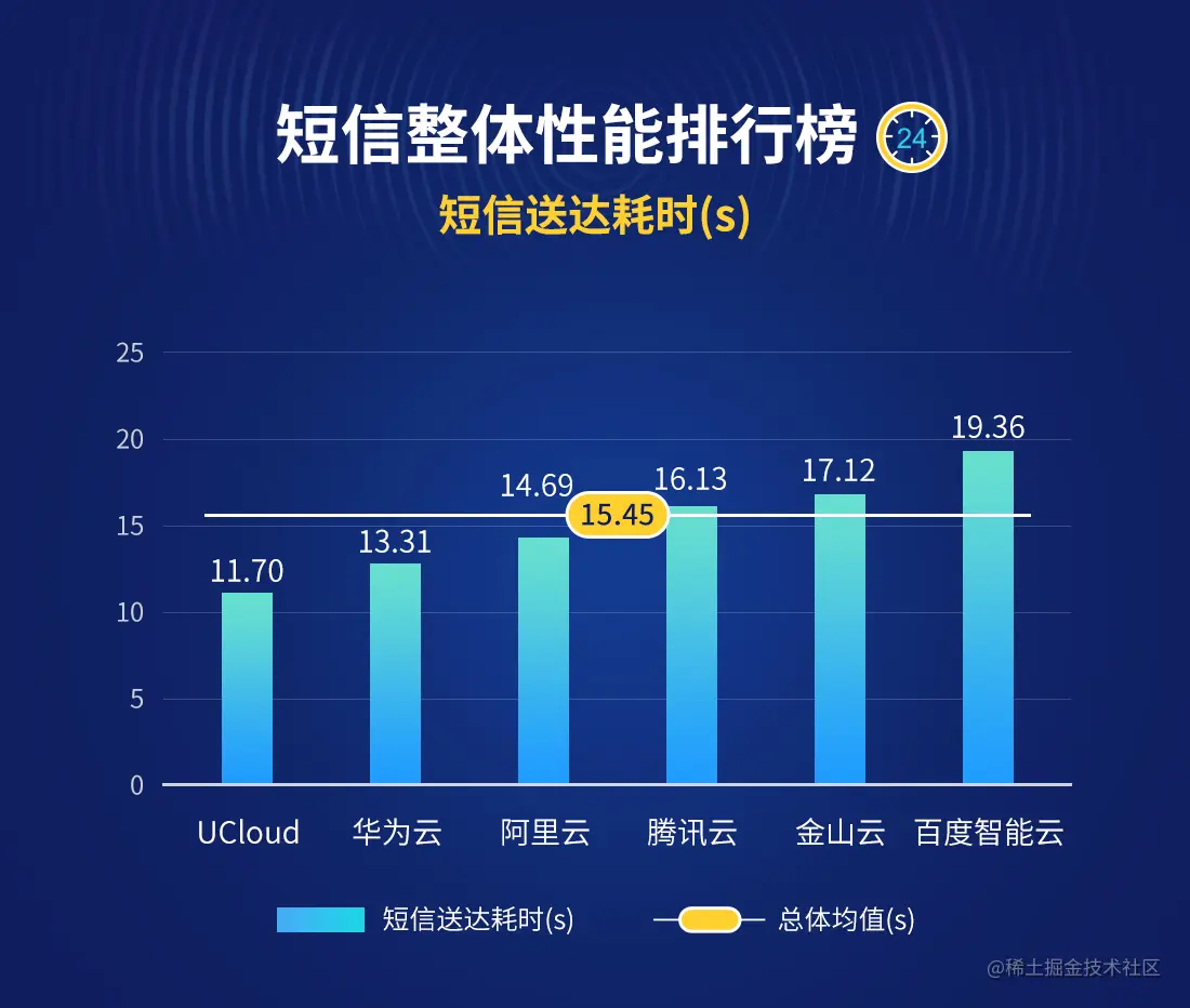 在2021年10月短信送达耗时排行榜中,短信送达耗时均值为15.45s,上月为16.93s,其中UCloud、华为云、阿里云位列前三。