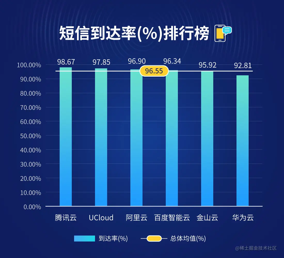 在2021年10月短信到达率排行榜中,总体到达率平均值为96.55%,其中腾讯云以98.67%的到达率蝉联冠军,与UCloud、阿里云位列前三。