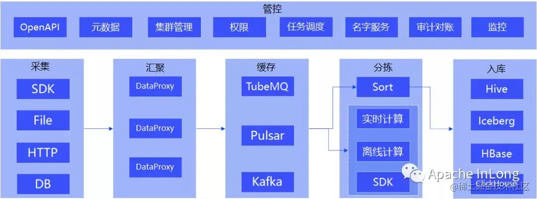 Apache InLong 以腾讯内部使用的 TDBank 为原型,依托万亿级别的数据接入和处理能力,整合了数据采集、汇聚、存储、分拣数据处理全流程,拥有简单易用、灵活扩展、稳定可靠等特性。