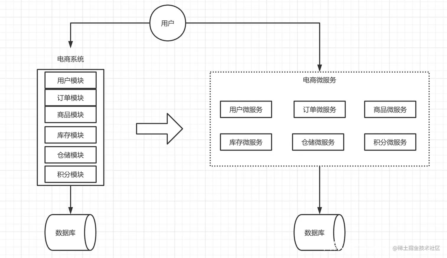 微服务架构,重点在一个微字,简单的说就是将单体服务拆分成更多更小的服务,每个服务都是一个独立的,可以运行的项目。我们来看一张图: