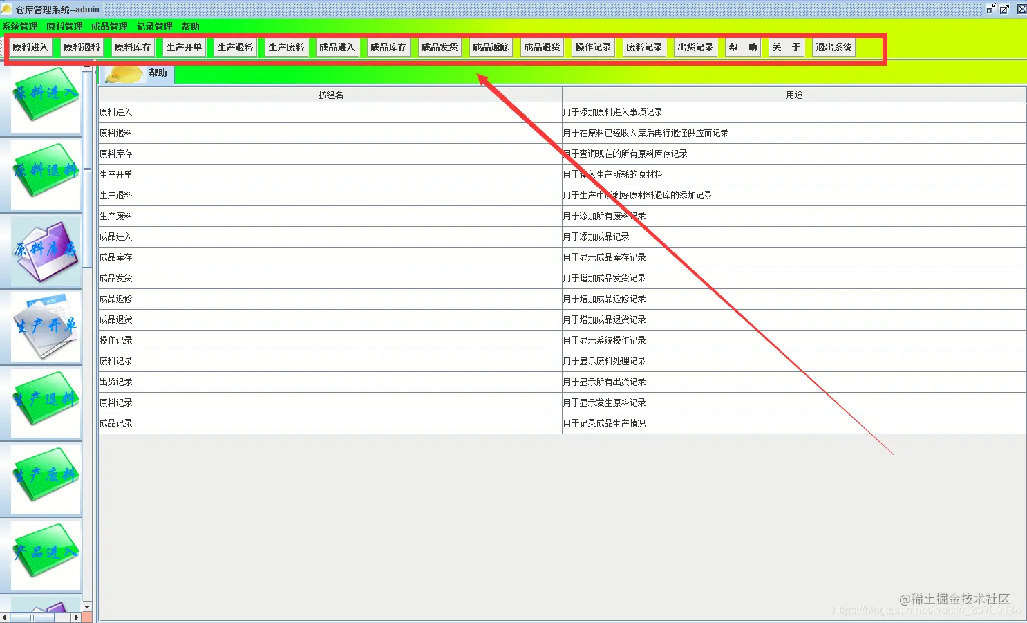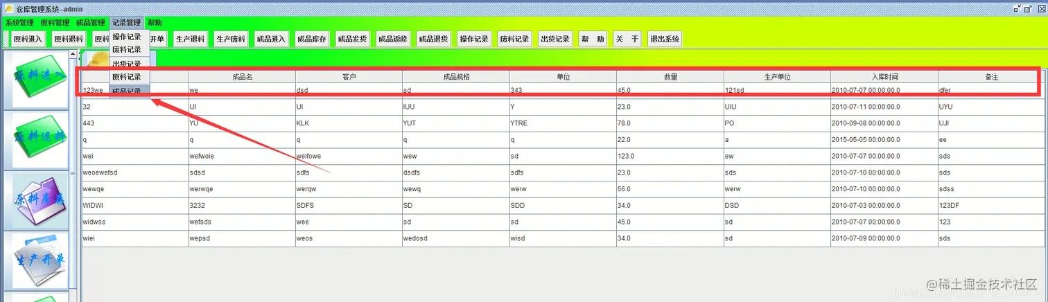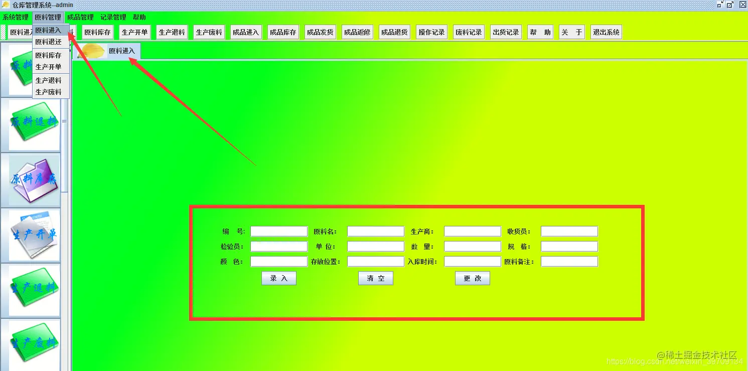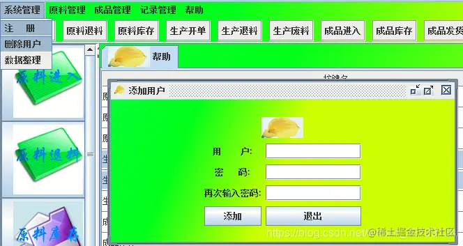 本项目是使用Java swing开发,可实现仓库管理系统登陆/注册/重置、登录后可以进行系统管理、原料管理、成品管理、管理记录以及注销退出等几大模块。界面设计比较简介、适合作为Java初学者课设设计以及学习技术使用。