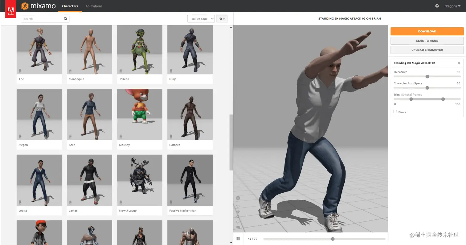 本文示例人物模型来源于mixamo.com,该网站有有上百种人物和上千种动作可自由组合,免费 下载。大家可以挑选自己喜欢的人物和动画动作来练习 Three.js。