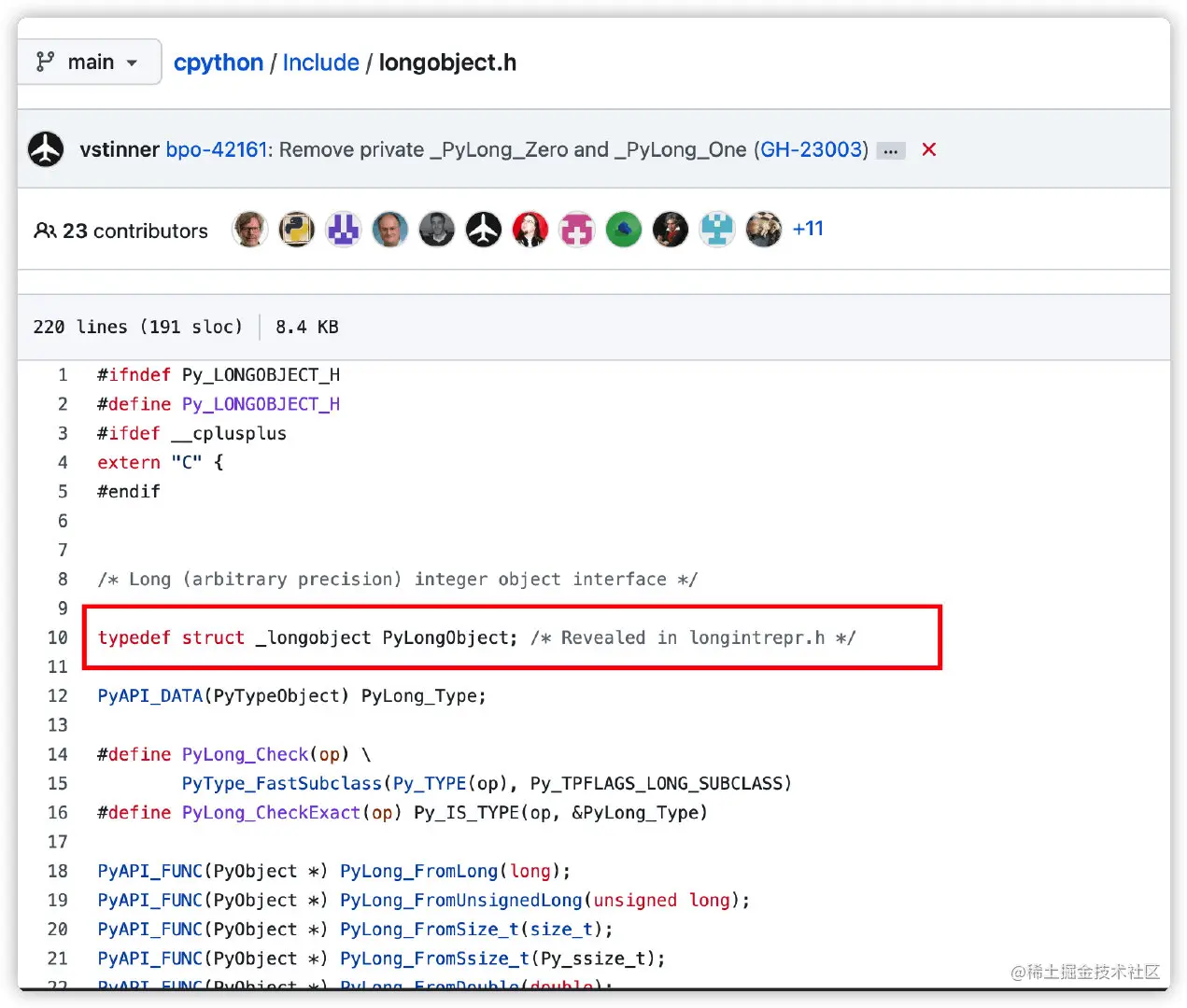 要想了解这个,那就需要看 Python 的源代码,Python中的整数底层对应的结构体是PyLongObject,它位于 longobject.h 中。