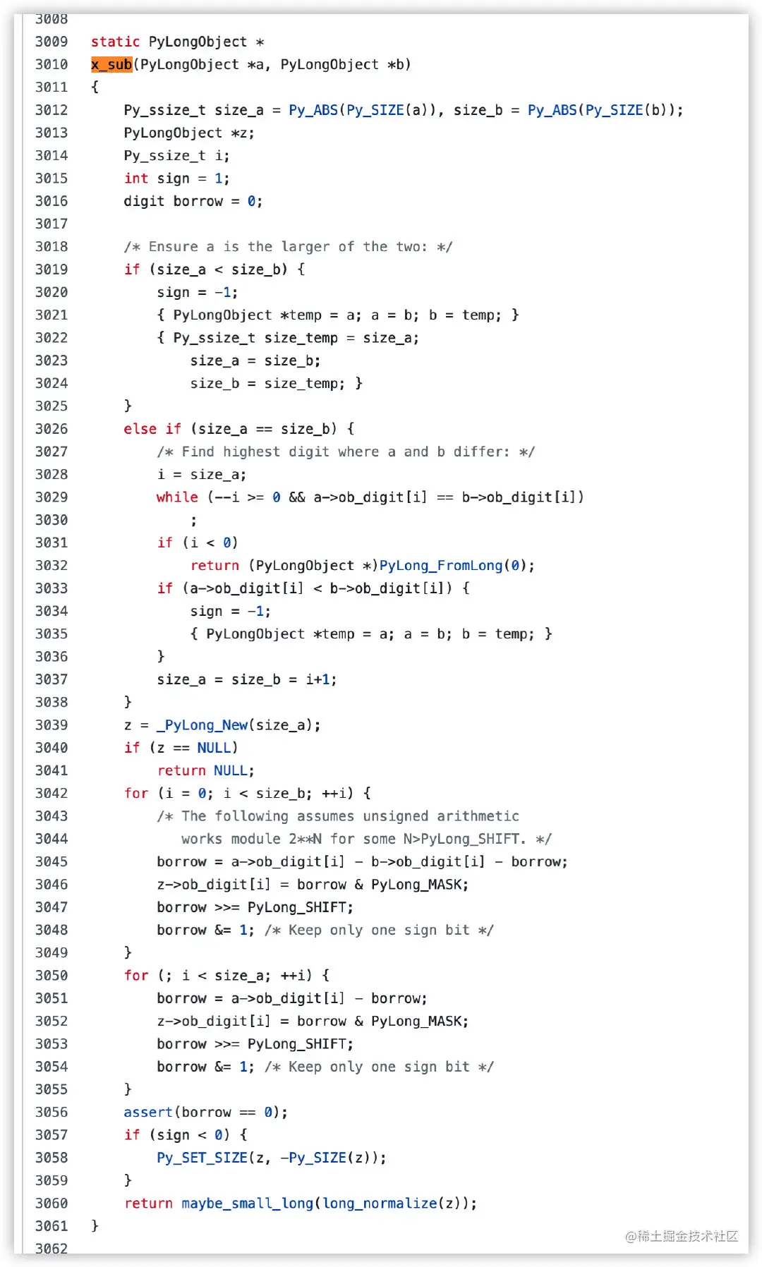 可以看到 long_add 根据 ob_size 的正或负来调用 x_add 或 x_sub。