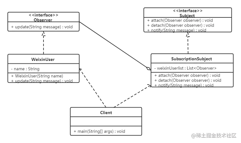 微信公众号是具体主题(具体被观察者),里面存储了订阅该公众号的微信用户,并实现了抽象主题中的方法