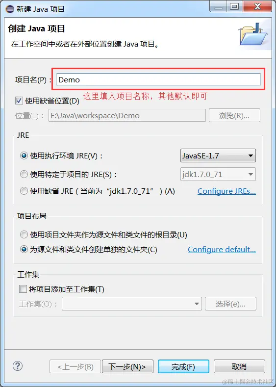 填入项目名称,点击“完成”,创建项目成功,可以看到在 E:\java\workspace 目录下多出了一个Demo文件夹。