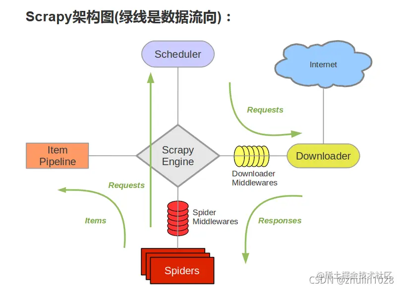 Scrapy Engine(引擎): 负责Spider、ItemPipeline、Downloader、Scheduler中间的通讯,信号、数据传递等。