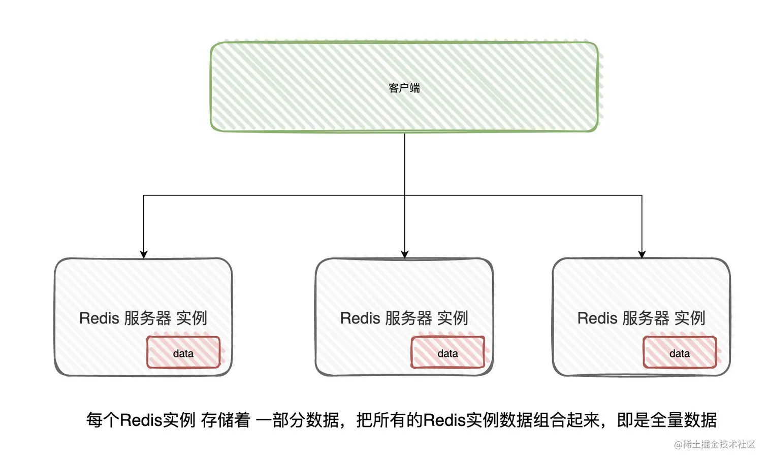 候选者:用多个Redis实例来组成一个集群,按照一定的规则把数据「分发」到不同的Redis实例上。当集群所有的Redis实例的数据加起来,那这份数据就是全的