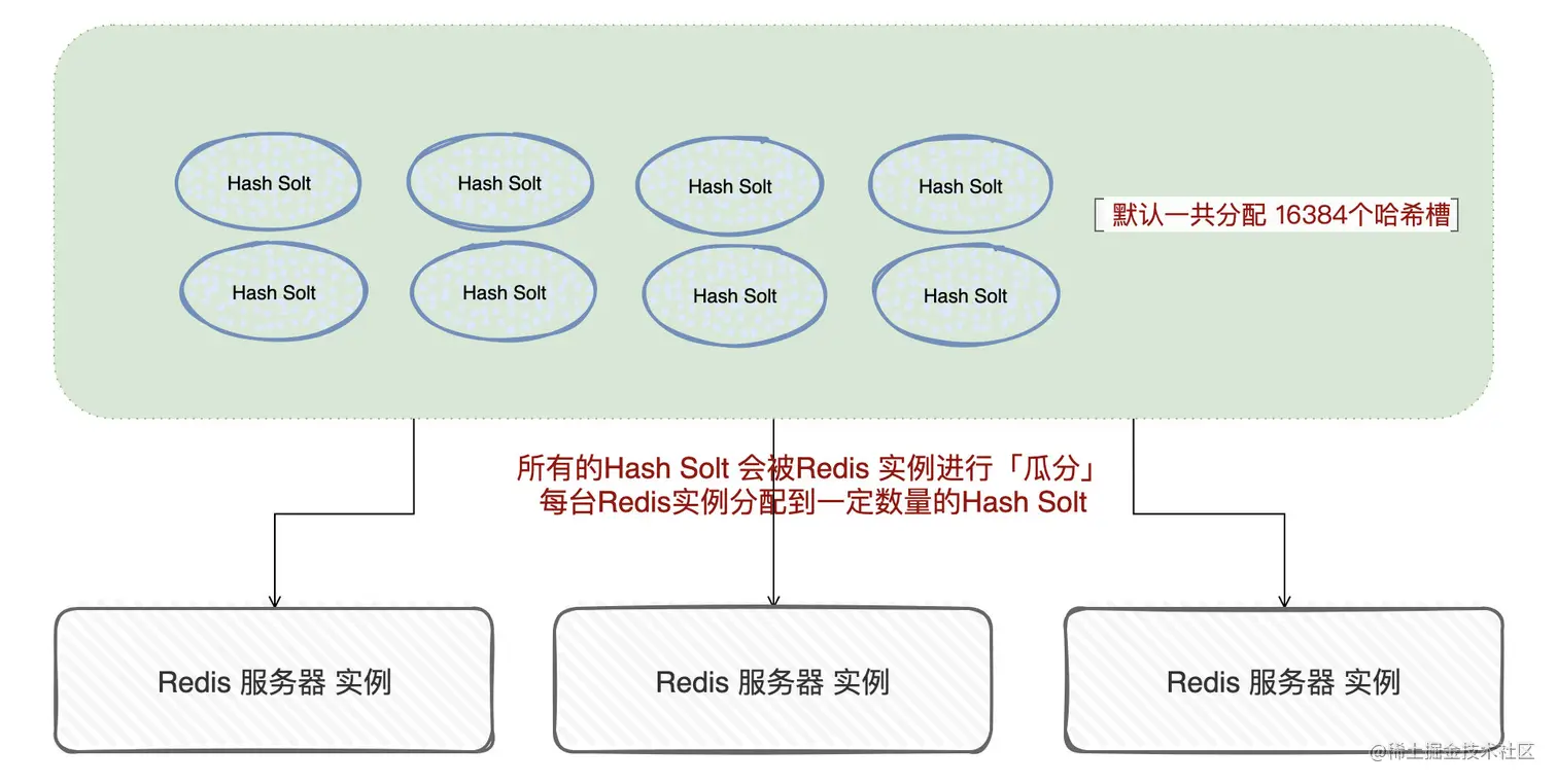 - Redis Cluster默认一个集群有16384个哈希槽,哈希槽会被分配到Redis集群中的实例中