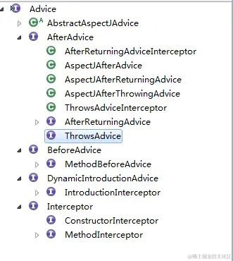 如上图可以看出Advice主要分为四个接口子类,一个是AfterAdvice(在目标方法执行后增加功能)、BeforeAdvice(在目标方法执行前增加功能)、DynamicIntroductionAdvice、Interceptor(拦截器)。AfterAdvice的子接口由AfterReturningAdvice和ThrowsAdvice,AfterReturningAdvice接口类有一个afterReturning方法,在目标方法执行完后才执行;ThrowsAdvice接口类是在目标方法执行后抛出异常时执行。BeforeAdvice的子接口有MethodBeforeAdvice,MethodBeforeAdvice接口有一个before方法,在目标方法执行前执行。