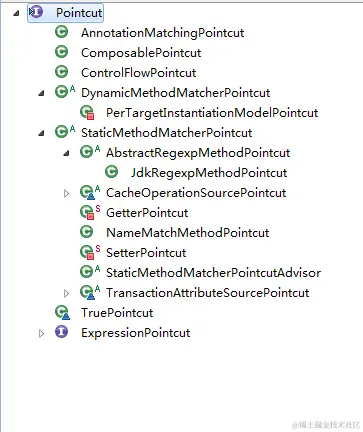 在Pointcut接口中,有两个方法,一个是getClassFilter(获取过滤类的类),一个是getMethodMatcher(获取过滤方法的类),从这里应该可以看出Pointcut的作用。