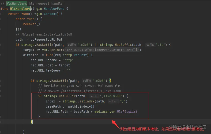 这个地方假如判为旧版本地址,就重定向到新版本的播放地址: