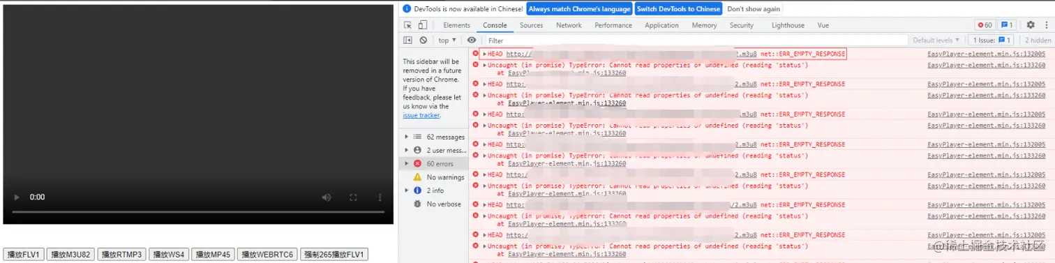 EasyPlayer.js可以播放不同格式的视频流,但我们发现测试m3u8时出现错误无法播放,报错信息为:net::ERR_EMPTY_RESPONSE