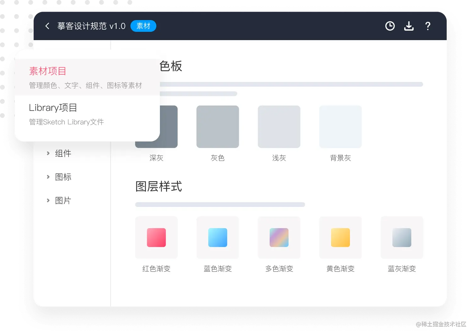 摹客还可以帮助我们创建素材项目和Library项目,管理颜色、字符样式、图层样式、组件、图标、图片资源和Library文件,快速统一项目的设计规范,实现设计资源高效复用。