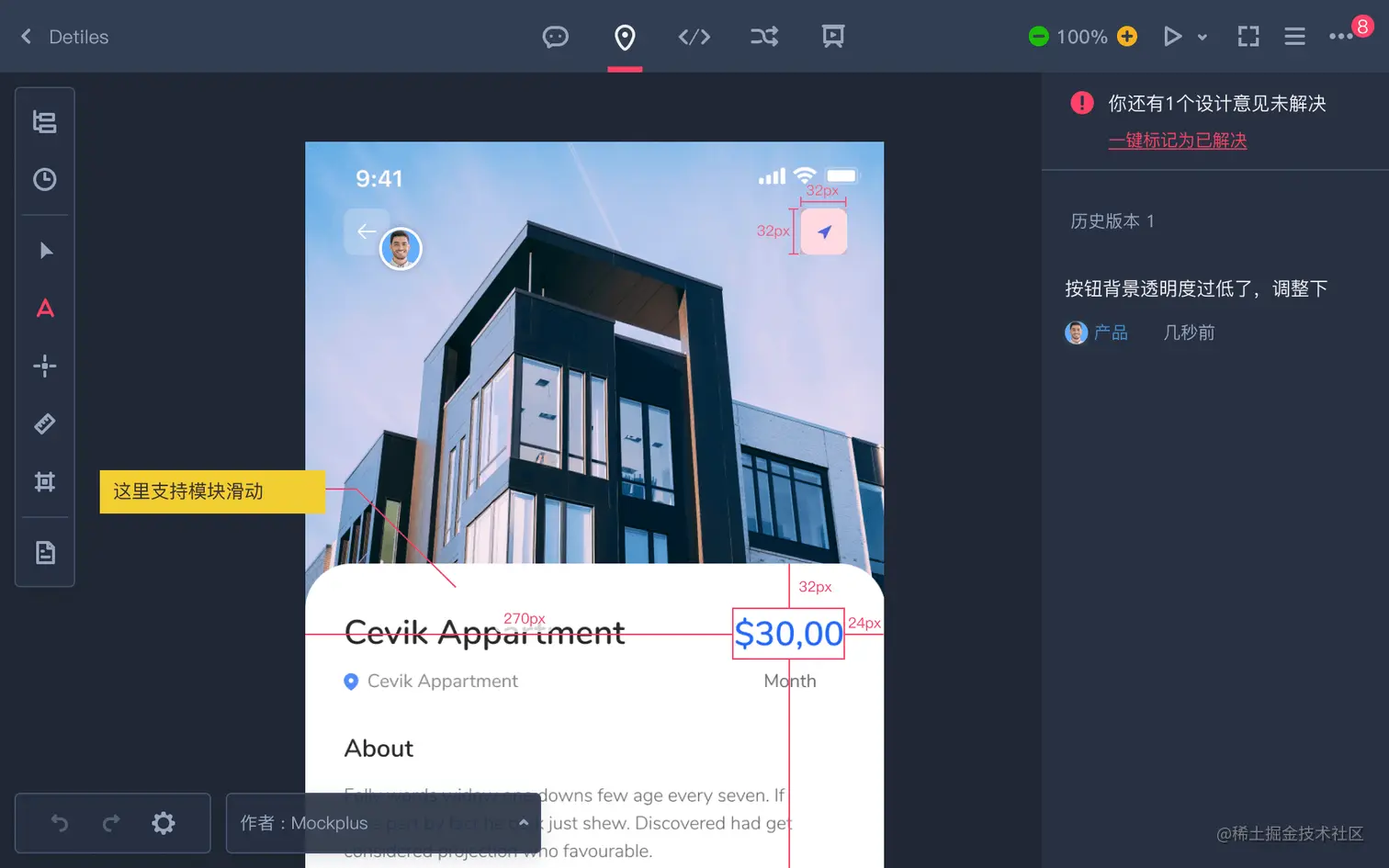 在摹客交付设计稿后,可以搭配使用5种工具来进行快速评审。且每条评审意见都有未解决、已解决、关闭三种状态,避免遗漏。评审时还可以对相关资源添加引用(例如一些动效的参考),让评审意见表达的更清晰完善。