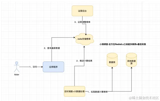为啥不是实时计算呢?其实在真正的高并发项目,都是预先计算好结果,然后直接返回数据,这样存储结构最简单。下面来简单讲解下,首先用户访问这个应用程序,应用程序再从Redis榜单里获取数据。但这个Redis榜单又是如何获取的呢?会有一个定时调度的任务+大数据处理的方法,这个方法先从数据库获取数据源再进行统计,统计完成后再给Redis中存储榜单。运营后台也可以人工的调动榜单。