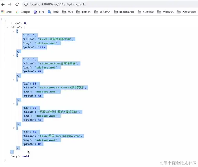 上面就实现了程序实现的榜单排行了,下面我们在继续模拟人工运营操作榜单的实现,再重新发送请求后,你会发现上面榜单第二名的"Alibaba全家桶实战"已经被替换掉,这实战例子就实现了人工替换榜单的教程。