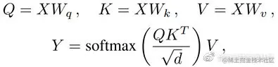 其中Q、K和V的三个参数W是大小为d×d的学习参数,它们分别将输入序列X投影到queries、keys和values中。编码特征Y是计算值V的凸组合,相似性矩阵由queries和keys的点积计算。