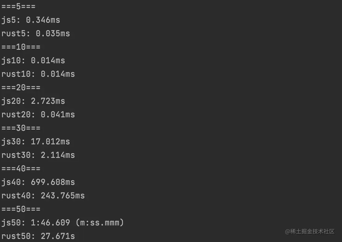 neon 开发nodejs模块与js开发模块性能对比 前端趣闻 2021-11-19 421 阅读1分钟 neon 是一个桥接nodejs与rust的库,能够让开发者使用rust开发模块让nodejs程序调用 一、斐波拉契数列 使用nodejs计算斐波拉契数列 使用rust开发nodejs模块计算斐波拉契数列 执行: 结果: 二、md5 使用nodejs计算MD5 使用rust开发nodejs模块计算MD5 执行: 结果: 三、jwt 编码解码 使用nodejs jwt 编码解码 / 使用rust开发nodejs模块 jwt 编码解码 结果: